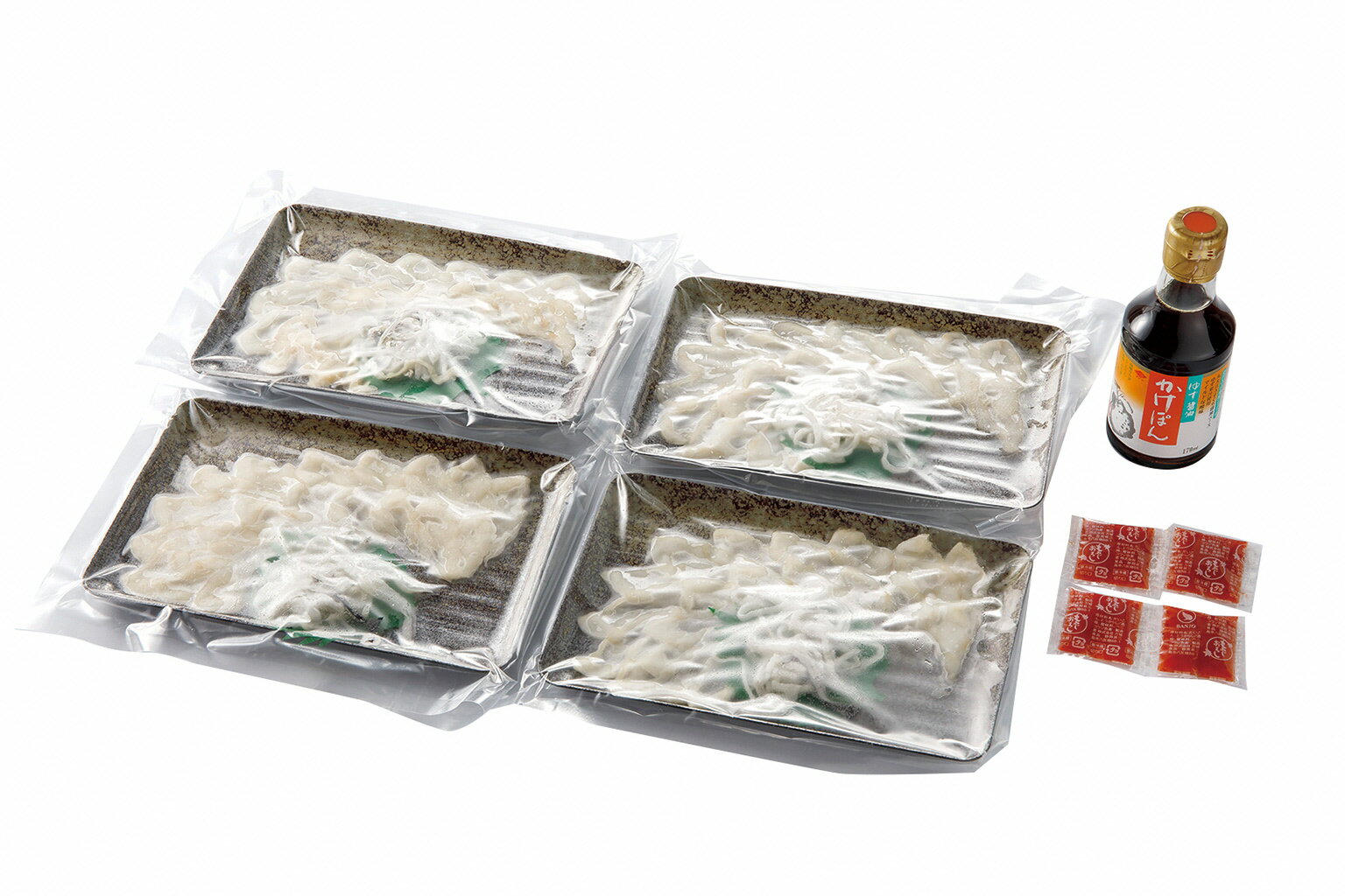 商品詳細 商品名平戸おうごんとらふぐ刺身セット(4人前) 内容量・おうごんとらふぐ刺身 約20g×4P ・おうごんとらふぐ皮湯引き 約10g×4P ・もみじおろし 5g×4袋 ・ポン酢 170ml×1本 【4人前】 保存方法冷凍 賞味期限冷凍30日 アレルゲン 商品説明とらふぐ生産量日本一。