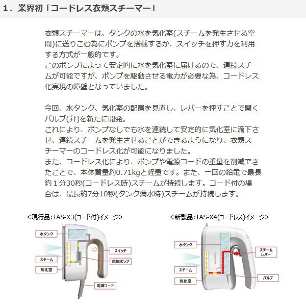 ■ 東芝 ■◆ 主な特徴 ◆1. どこでもサッと手軽に使える、業界初「コードレス衣類スチーマー」2. コート・ジャケットなどの厚物衣類にはコード付でも使える、コードレス/コード付2way機構3. フラットなかけ面付きで、コードレスアイロンとしても使用可能な1台2役 ◆ 主な仕様 ◆電源交流100V(50/60Hz共用)消費電力1200Wスチーム量シャワースチーム:最大約12mL/分スチーム:最大約9mL/分タンク容量65mL立ち上がり時間約40秒(かけ面温度「高」)コード長約2.0m質量約0.71kg(コード付時:約0.86kg)寸法(約)長さ17.9×幅7.1×高さ13.7cm付属品コードセット、スタンド、収納袋、水量カップ